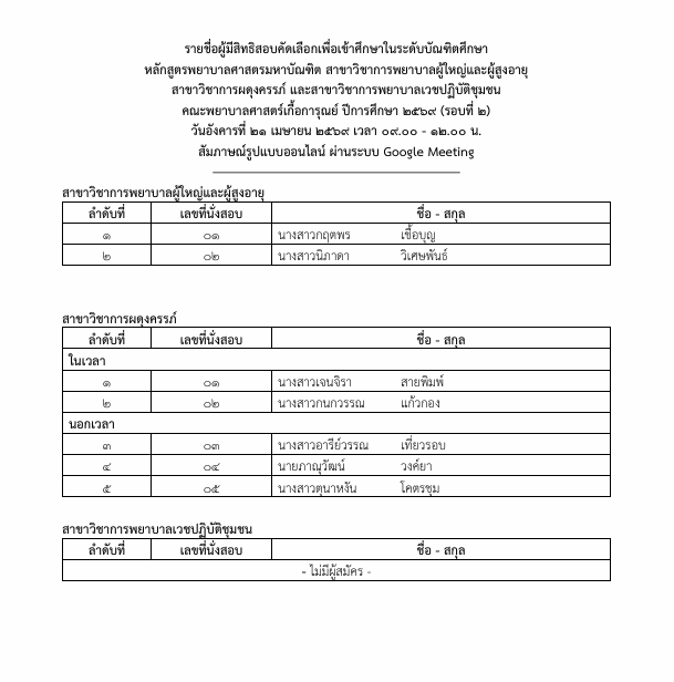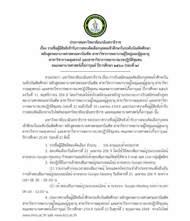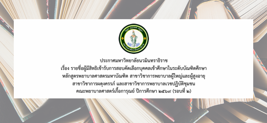 ประกาศมหาวิทยาลัยนวมินทราธิราช รายชื่อผู้มีสิทธิเข้ารับการสอบคัดเลือกบุคคลเข้าศึกษาในระดับบัณฑิตศึกษา หลักสูตรพยาบาลศาสตร์มหาบัณฑิต