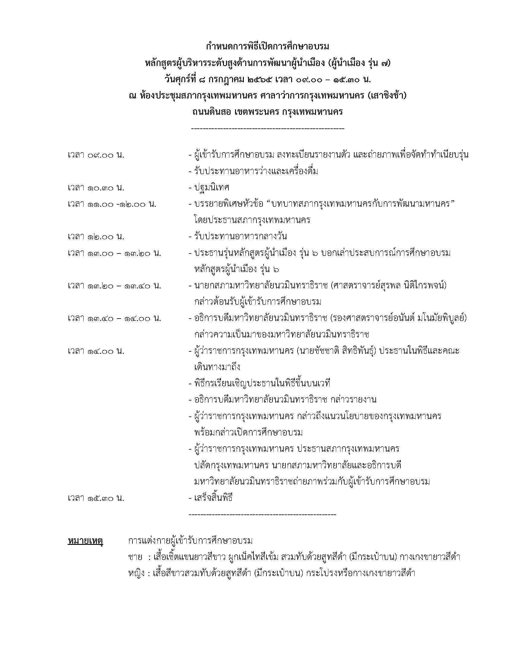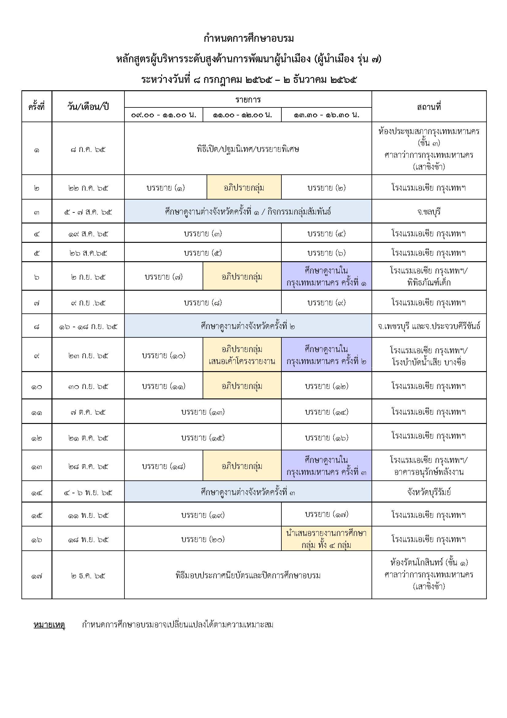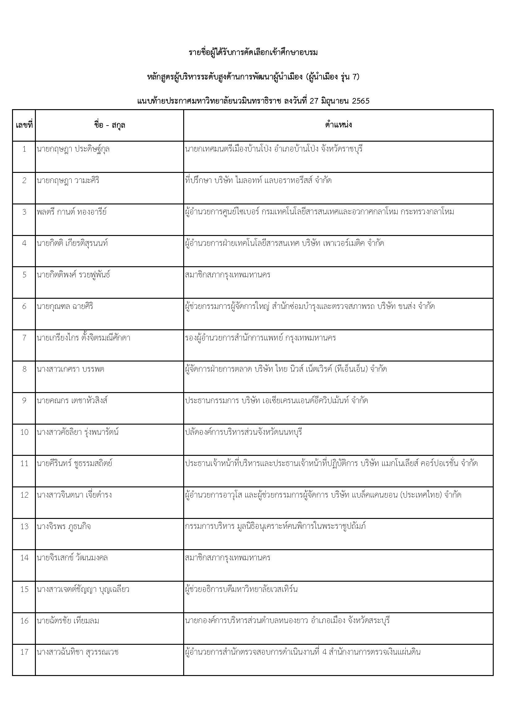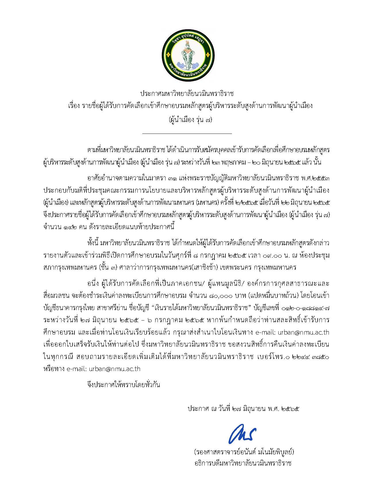 ประกาศรายชื่อผู้มีสิทธิเข้ารับการศึกษาอบรมหลักสูตรผู้บริหารระดับสูงด้านการพัฒนาผู้นำเมือง (ผู้นำเมือง รุ่น 7)