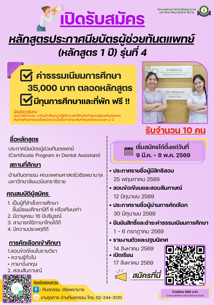 🦷 ประกาศรับสมัครและคัดเลือกบุคคลเข้าศึกษาหลักสูตรประกาศนียบัตร ผู้ช่วยทันตแพทย์ (หลักสูตร 1 ปี) รุ่นที่ 4 ประจำปีการศึกษา 2569🏥