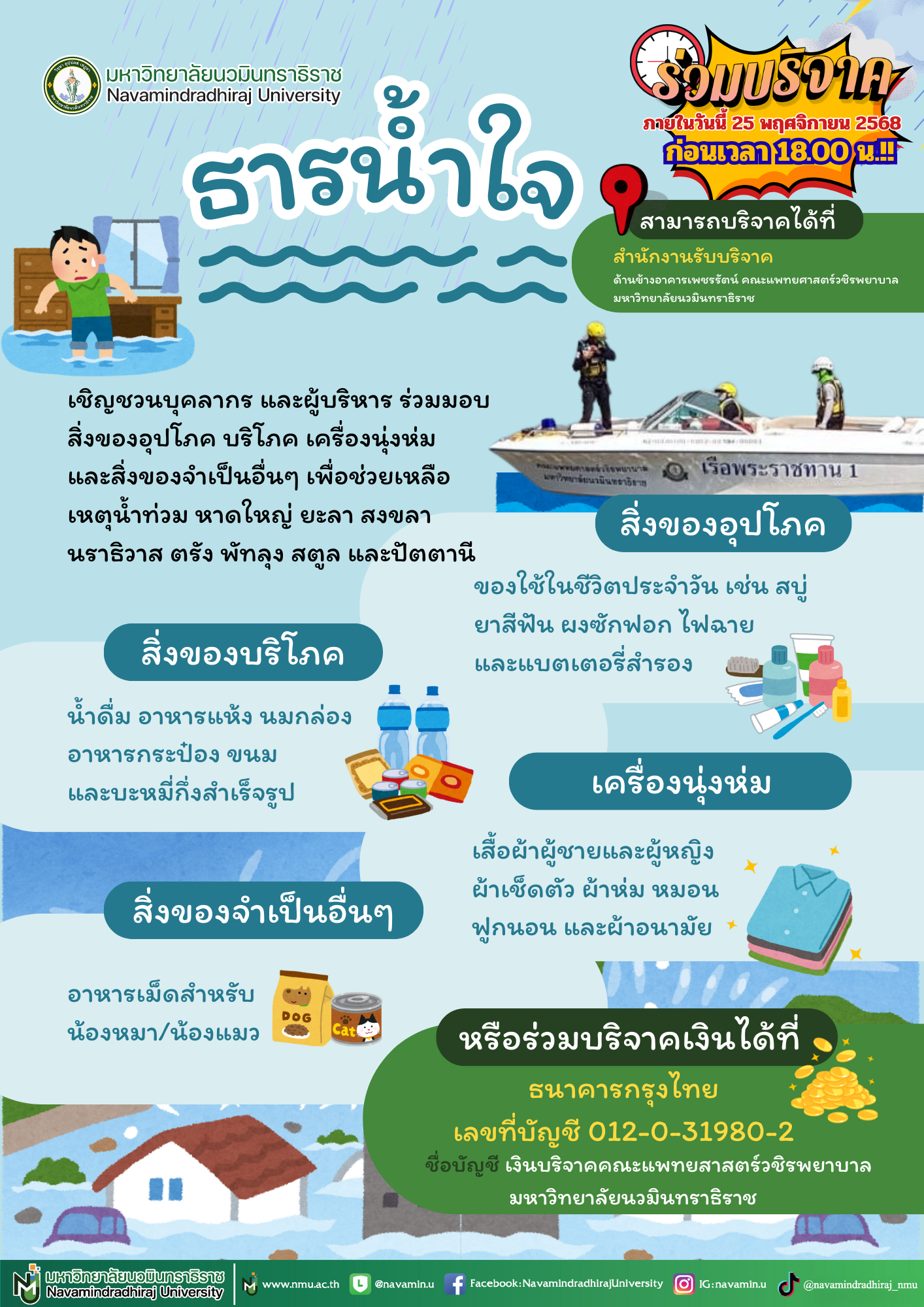 ขอเชิญชวนบุคลากร ผู้บริหาร และผู้มีจิตศรัทธา ร่วมมอบสิ่งของอุปโภค บริโภค เครื่องนุ่งห่ม และสิ่งของจำเป็นอื่นๆ