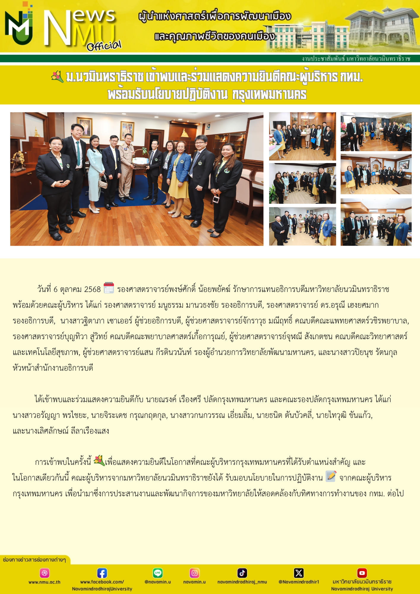 📢 ม.นวมินทราธิราช เข้าพบและร่วมแสดงความยินดีคณะผู้บริหาร กทม. พร้อมรับนโยบายปฏิบัติงาน กรุงเทพมหานคร