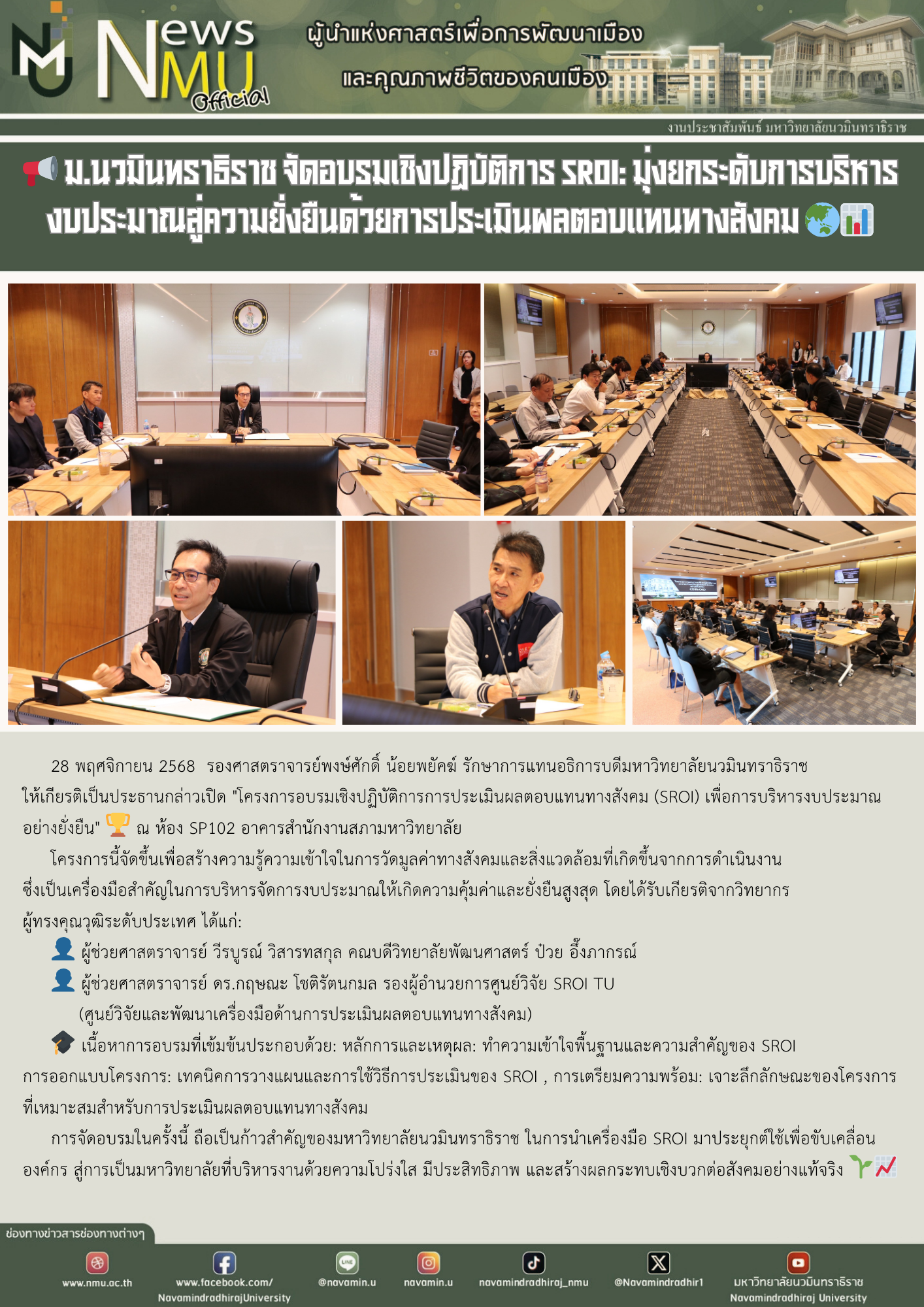 📢 ม.นวมินทราธิราช จัดอบรมเชิงปฏิบัติการ SROI: มุ่งยกระดับการบริหารงบประมาณสู่ความยั่งยืนด้วยการประเมินผลตอบแทนทางสังคม 🌏📊