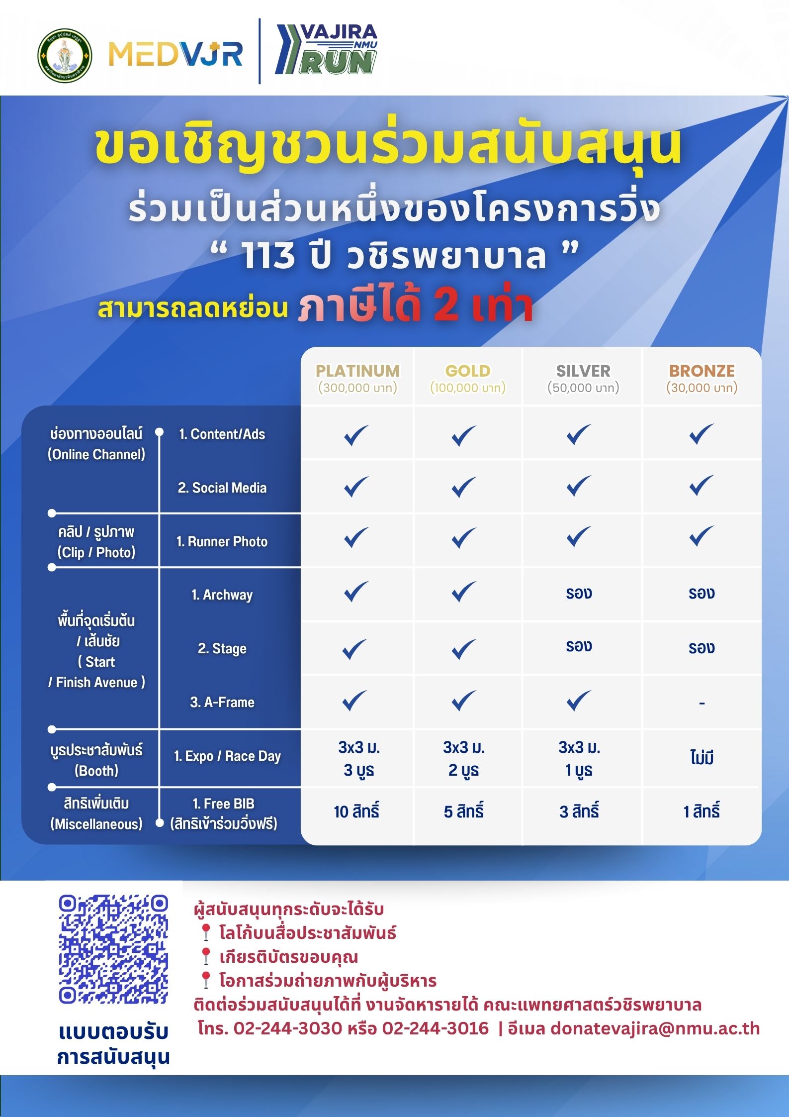 🏃♀️📣 ข่าวดีสำหรับนักวิ่ง! VAJIRA NMU RUN กลับมาแล้ว! 🏃♂️💨 เตรียมร่างกายให้พร้อม! คณะแพทยศาสตร์วชิรพยาบาล มหาวิทยาลัยนวมินทราธิราช ขอเชิญชวนทุกท่านมาร่วมงานวิ่งสุดยิ่งใหญ่ VAJIRA NMU RUN ในวัน RACE DAY: 7 ธันวาคม 2025! 📍 สถานที่: คณะแพทยศาสตร์วชิรพยาบาล มหาวิทยาลัยนวมินทราธิราช ประเภทการแข่งขันที่เปิดรับ: 10 KM 🥇 4 KM 🥈 2 KM 🥉 🔥 PACKAGE สุดคุ้ม (ราคา/เสื้อ/เหรียญ): RACE SHIRT ดีไซน์สวยงาม โดดเด่น! 👕 FINISHER MEDAL เหรียญสุดเท่สำหรับผู้พิชิตเส้นชัย! 🏅 ประกันอุบัติเหตุ ครอบคลุม 100% (ไม่รวมการบาดเจ็บจากการวิ่ง) ✉️ 🎯 สมัครด่วน! โอกาสดีๆ ที่จะได้ออกกำลังกาย สร้างสุขภาพดี และยังได้รับเสื้อและเหรียญที่ระลึกสุดพิเศษ! มาร่วมเป็นส่วนหนึ่งของกิจกรรมวิ่งเพื่อสุขภาพกับ VAJIRA NMU RUN! แล้วเจอกันวันที่ 7 ธันวาคม 2568 นะคะ! 👋🥳 ขอเชิญร่วมสนับสนุน ร่วมเป็นส่วนหนึ่งของโครงการวิ่ง "113 ปี วชิรพยาบาล"