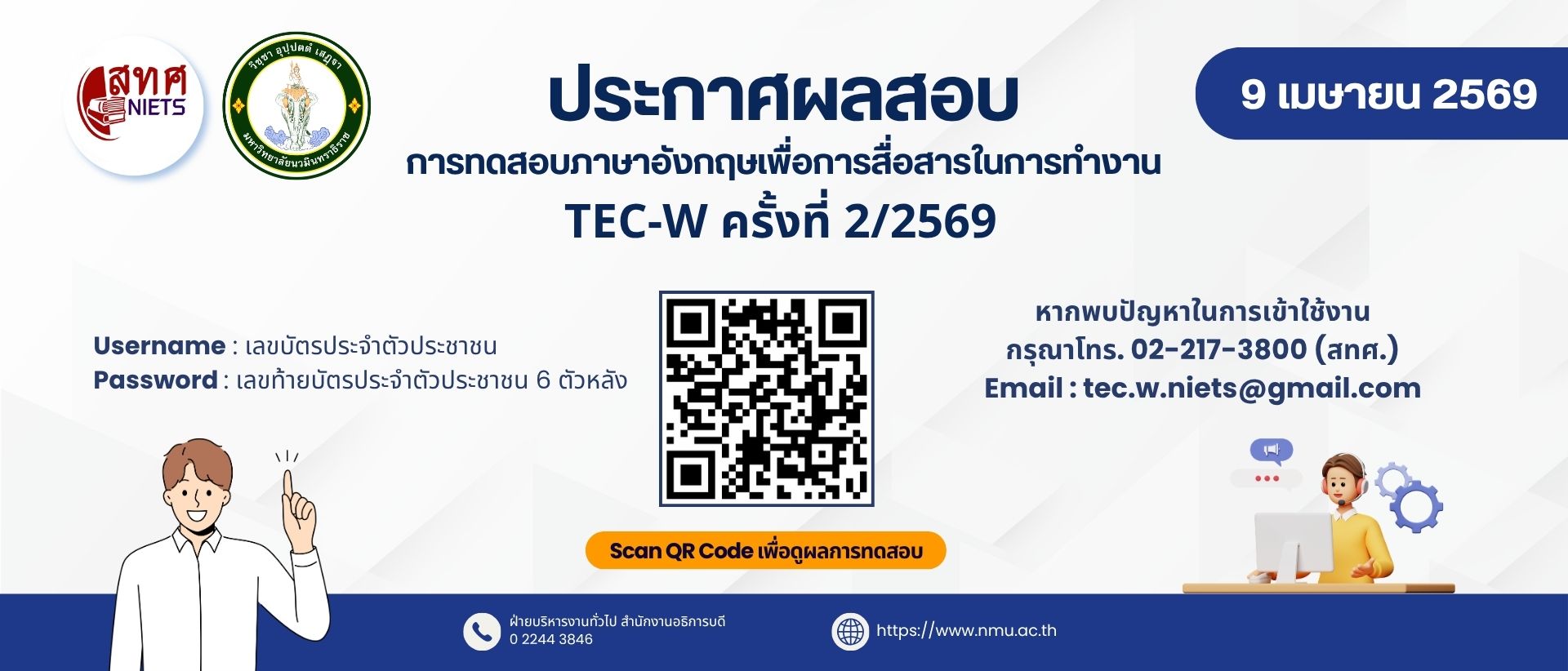 📢 ประกาศแจ้งผลการทดสอบภาษาอังกฤษเพื่อการสื่อสารในการทำงาน (TEC-W) ครั้งที่ 2/2569